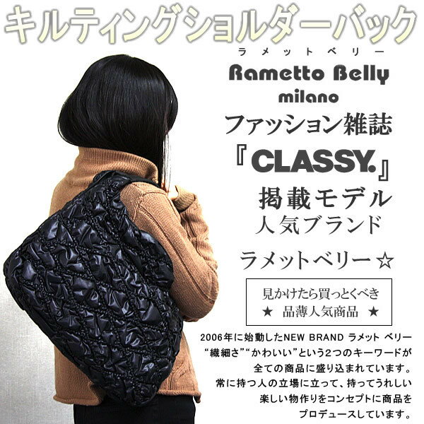 ファッション雑誌CLASSY.掲載!Rametto Belly ラメットベリー キルティングショルダーバッグ RAB1639BK2006年に始動した、ファッション誌やモデル読者の間でも評判のNEWブランド Rametto Bellyラメットベリー☆“繊細さ”“かわいい”という2つのキーワードが全ての商品に盛り込まれています。“繊細さ”は商品作りに活かし、“かわいい”は商品の要のデザインにフィードバッグ。常に持つ人の立場に立って、持ってうれしい楽しい物作りをコンセプトに商品をプロデュースしています。とっても軽やかで手触りのいいツヤツヤナイロンをドレープの美しいキルティングに加工していて独特の華や